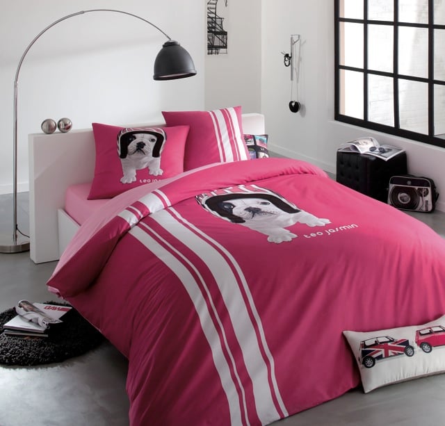 Alors au cas où vous n’auriez pas deviné que ma maîtresse est totalement dingo de l’univers canin, je vous en donne encore une preuve ! Elle n’a pas résisté à acheter la parure de lit : je suis jaloux et je sens que je vais cauchemarder. Dire que lui arbore sa truffe sur le lit de ma maîtresse, alors que je suis persona non grata ! Je crie au scandale : arrière bouledogue !