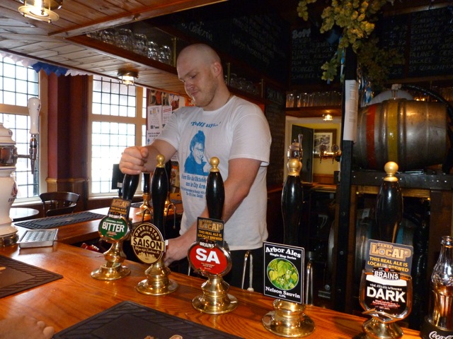 Pour commencer, il faut prendre des forces dans un des plus anciens pubs de Cardiff, situé en face du Stadium Millenium. Tiens, ça tombe bien, le garçon a l’air plutôt sympa et en plus, j’ai vu une vieille pub de bière avec des cabots, accrochée au mur : j’ai l’oeil !