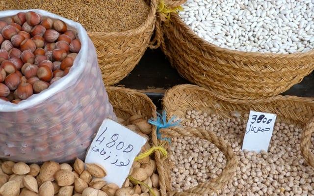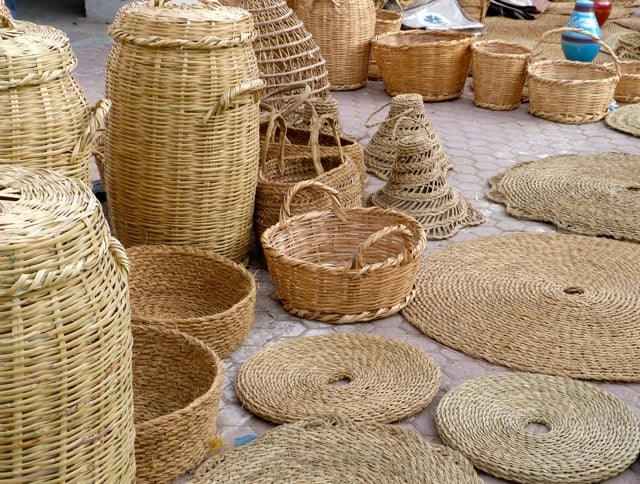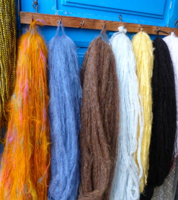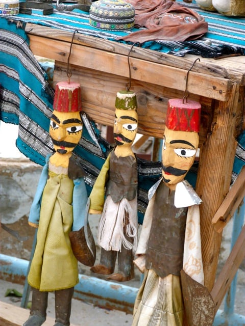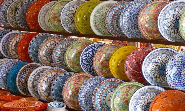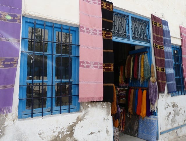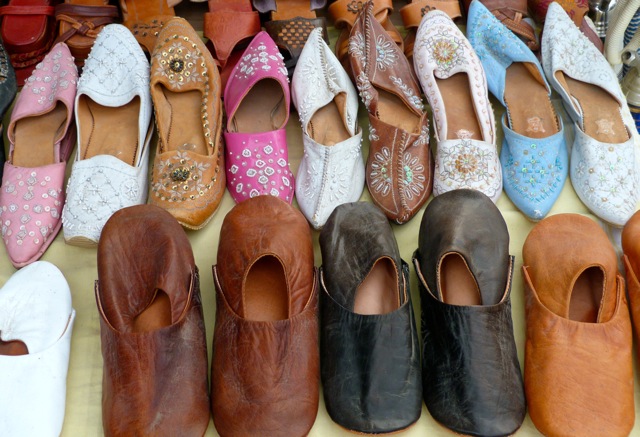 Poteries de toutes les couleurs, foutas chatoyantes unies ou à rayures, épices, eau de rose et de fleurs d’orangers, thé à la menthe, vanneries,… où il faut marchander juste par jeu. Oh les jolies paires de babouches, une djellaba !