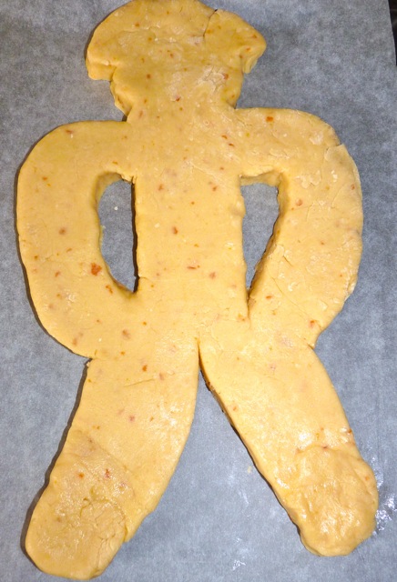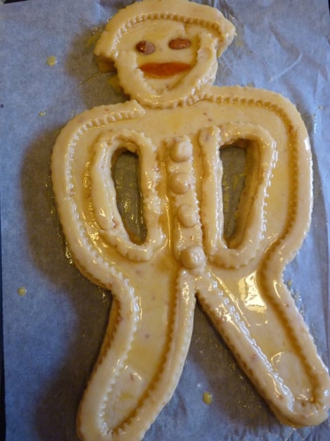 Découpe et mise sur place : avec un petit couteau d’office, entaillez comme suit en faisant un demi cercle pour le chapeau, des bandes pour le corps, les bras… pour les yeux, ma maîtresse s’est amusée à mettre des amandes et elle a confectionné la bouche avec un morceau d’écorce d’orange confite. Elle était en panne de raisins de Corinthe… qui peuvent être très bien aussi pour les boutons de l’uniforme. Il y a aussi une moustache… Oups, ma maîtresse a oublié ce détail !
