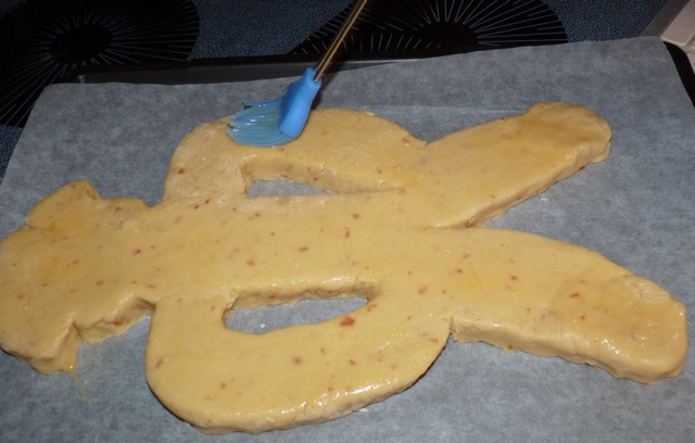 Dans un grand saladier ou si vous êtes équipé comme ma maîtresse d’un robot, malaxez bien en pommade le beurre, le sucre, la levure et d’orange confite. Ajoutez les oeufs petit à petit. Lorsque le mélange est bien crémeux, ajouter le parfum. Enfin incorporez la farine et stoppez tout dès que vous obtenez une pâte homogène. Entourez ce pâton de 5 kg d’un torchon et laissez reposer une bonne demi heure. Détaillez en bâton de 950 grammes et gardez le reste pour les décors.