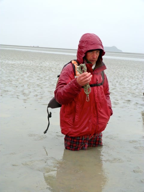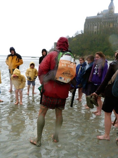 Le pied de cette petite marche à marée basse ? Ben pour tout vous dire, au-delà de faire ça à pattes, vous allez faire subir une bonne thalasso à vos petons ! Car vous allez marcher pieds nus : rien de tel pour sentir toutes les bonnes sensations du sable, l’eau bien fraîche en ce matin d’avril, et surtout les sensations fortes des sables mouvants ! Une sacrée expérience à vivre avec les explications de Romain !
