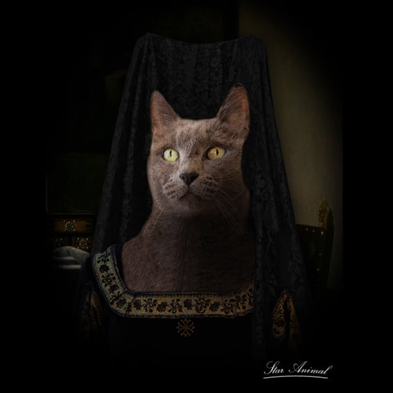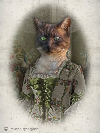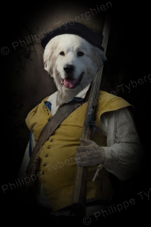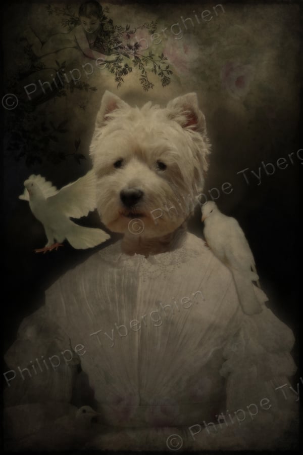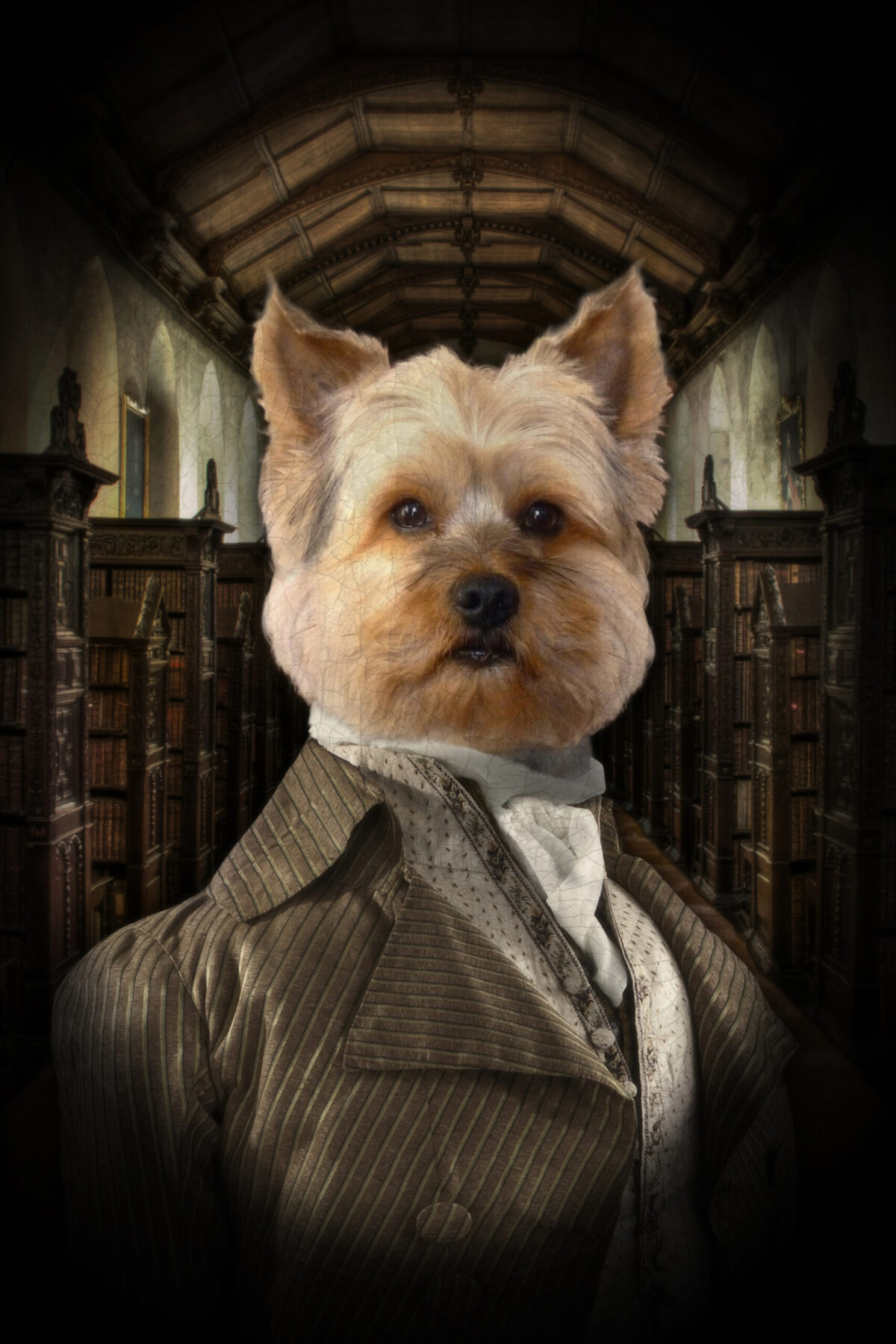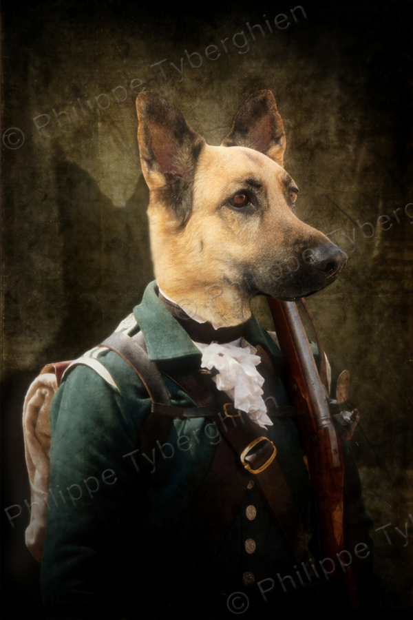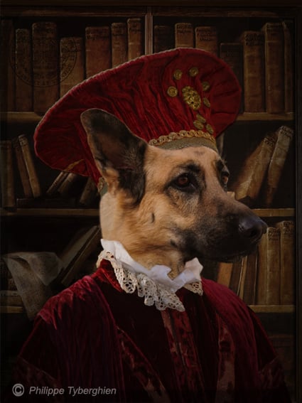 A l’arrivée d’Uggo (il y a presque 9 ans) j’ai commencé à prendre beaucoup de photos de lui car il a une bonne tête (ce n’est pas moi qui le dit, tout le monde est unanime). Un peu plus tard vers 2006, je travaillais sur un projet artistique en liaison avec l’école des beaux arts de Saint Etienne et en particulier le tissage de belle étoffe. Je feuilletais de très beaux livres de portraits anciens et m’est venu l’idée de « grimer » mon Uggo en lord ou dandy. Le premier portrait était né. Encadré dans le salon et apprécié de tous, mes amis (surpris, amusé ou intéressé) m’ont encouragé à travailler sur les propres animaux, puis les animaux des amis d’amis,puis d’amis d’amis d’amis. J’ai senti le potentiel d’autant que mes recherches sur le sujet m’ont amené à peu de résultats, l’art animalier de genre est très peu développé, seuls quelques peintres travaillent le sujet mais aucun artiste ne travaille la photo comme je le fait. C’est aussi par amour pour la peinture ancienne (surtout la peinture flamande et italienne des XVI et XVII siècles) que j’ai souhaité travailler ma photo comme des toiles anciennes et reprenant postures, styles et effets de toiles patinées, un peu usées par le temps. J’ai beaucoup travaillé sur mon style et la qualité d’un rendu « authentique » numérique.