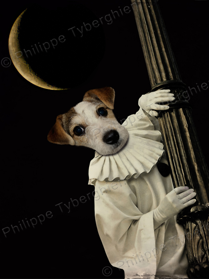 J’avoue avoir un faible pour Uggo évidemment mais plusieurs portraits m’ont plus plu que d’autres. Le Pierrot par exemple, que j’ai réalisé après un voyage à Venise lors du carnaval (qui est une formidable fête et une source d’inspiration intarissable) ou un portrait en Lawrence d’Arabie réalisé sur mesure pour un client. Pour les modèles féminins, c’est plus difficile : il y a Hortense ou Mireille que j’apprécie vraiment, je termine une nouvelle série de portraits « renaissance » actuellement et j’y ai pris beaucoup de plaisir, cela dépend également de l’animal sur lequel je travaille, il y a des races de chiens ou de chats (surtout de chiens) que j’affectionne particulièrement (lévrier, jack russell, berger, york, beagle) c’est donc plus agréable.