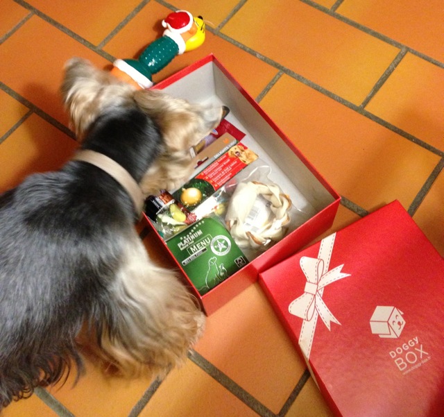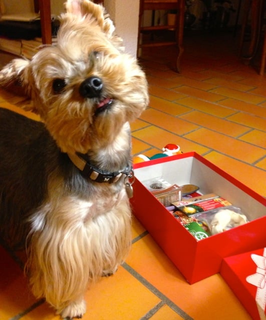 Impossible d’attendre ! Je n’ai pas résisté quand le facteur a sonné ce matin et m’a livré ma Doggy Box de Noël.