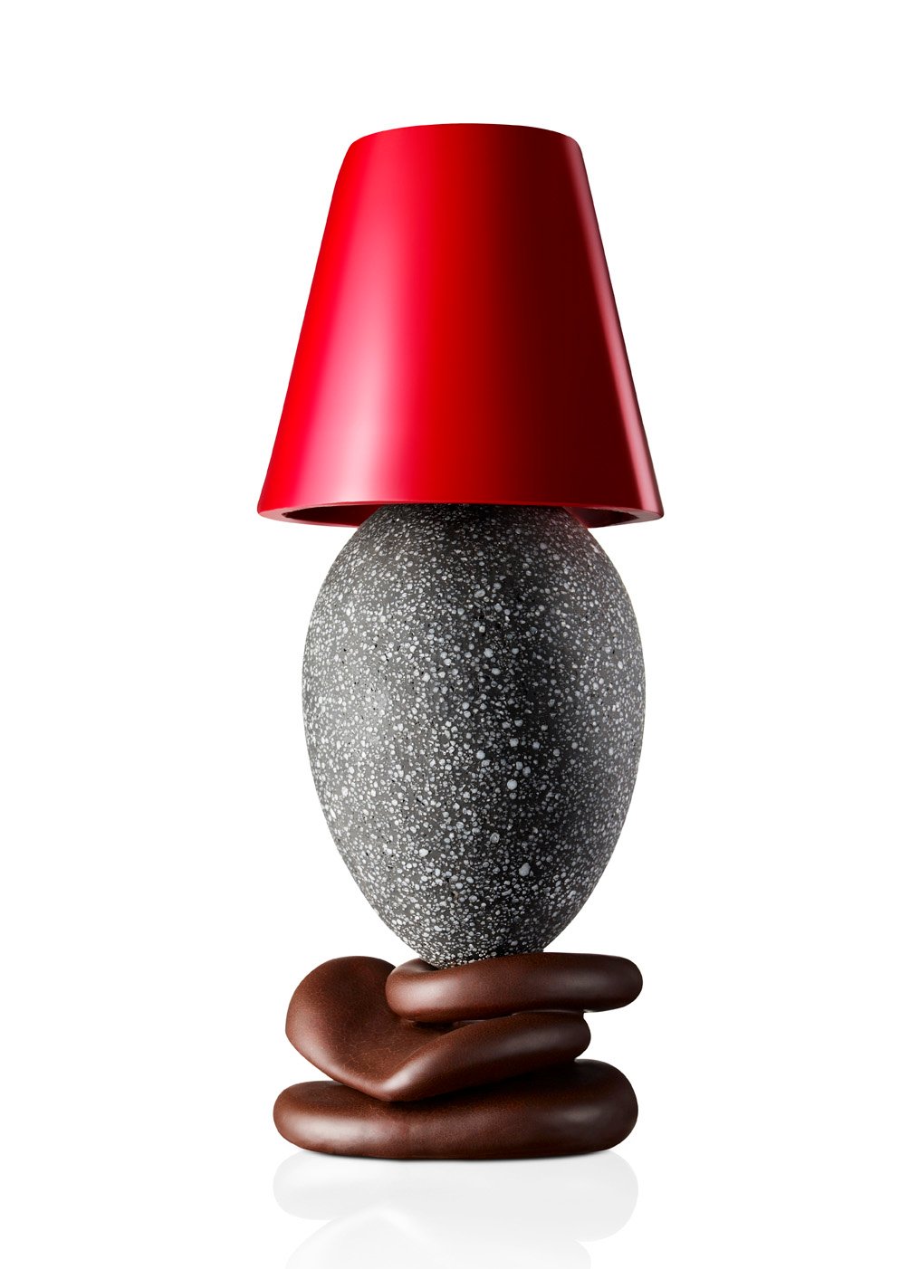 O merveille des merveilles que de voir le duo d’artistes, Christophe Michalak et le chef pâtissier Jean-Marie Hiblot, finaliser leur nouvel oeuf de Pâques ! Inspiré du mobilier art-déco des suites de l’hôtel, cet oeuf gourmand mais design se compose de trois galets de chocolat noir surmontés d’un œuf en granit noir incrusté d’éclats d’ivoire. Au centre,  j’ai aperçu un trésor de délicates douceurs chocolatées. Miam !!! Le tout est recouvert par un abat jour en chocolat blanc teinté de rouge, Plaza évidemment ! La classe.