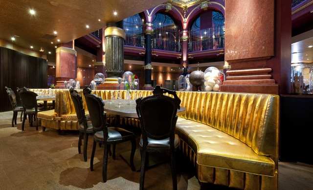 Dans le hall, au centre : une verrière élevée à 19 mètres du sol ; des colonnes de porphyre alternent avec des colonnes de pierre noire. Partout des moulures, corniches, gouttes, médaillons rehaussés à l’or sur un fond d’ocre rouge… C’est magique !